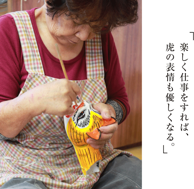 こちらに嫁いできて張子虎を作り始めました。私で5代目です。当時はベテラン職人が他にたくさんいたので、新人の仕事は糊付け。そうやって段々仕事を覚えて今に至ります。家業だからここまで続けてきましたね。虎の顔は世代ごとに少しずつ違います。男性が描くと勇猛な、讃岐弁でいう「がいな」顔。女性だと少し優しげな顔になってね。今の時代はかわいい系のものが多いから、虎の顔も自然と柔らかい感じになりますよね。