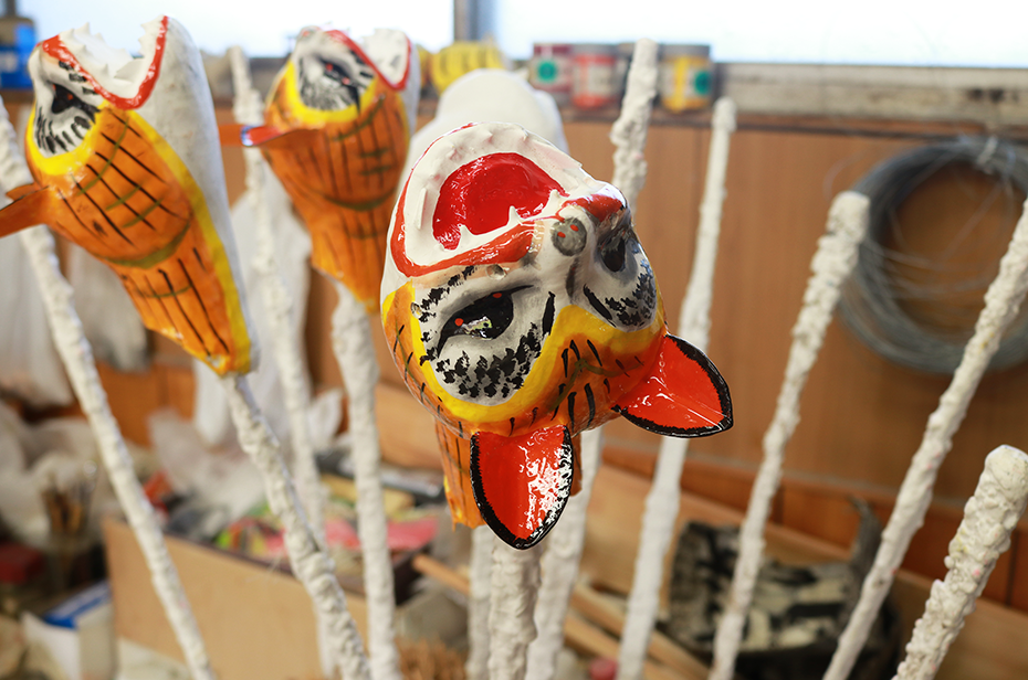 工房に入ると胡粉で真っ白なパーツがうず高く積まれている。奥では田井さんと職人の綾静子さんが座り、手分けして絵付け中だ。いつも優しく、ほのぼのとした語り口の田井さん。「大変よ~」と言いながらも、方々のイベントに呼ばれては制作体験をしたりキャラクターとコラボしたりと、張子虎を通してものづくりの面白さを伝えている。