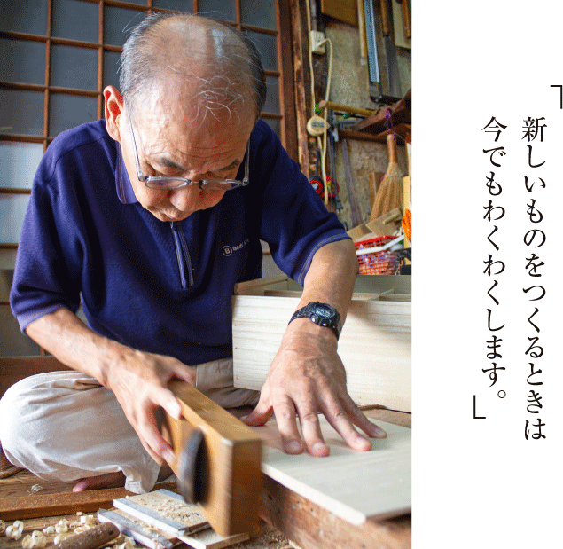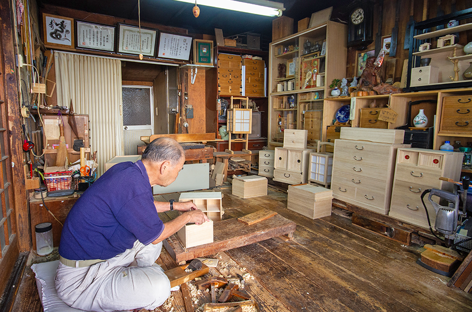 「この工房は三光鳥の鳴き声が聞こえるんよ」と外を見上げる、動物好きの道久さん。近年はフリーマーケットサイトを通じて県外から依頼があり、桐箪笥を作ってほしいと直接工房を訪ねてきたお客さんもいたそう。手を止めて「喜んでもらえて良かった」と笑みをこぼし、再び作業の続きに戻っていた。