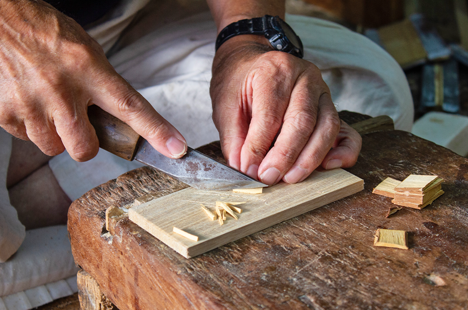 少しでも良いものをつくろう、といつも心に決めています。最新の機械はないけれど、手元にある道具で形にできるのが桐箱の良いところです。経年で反ることを見越して、接着剤は端だけにつけて余裕を持たせたり、つげの釘で留めて接着力を高めながらも、見た目が目立たないようにしたりと工夫しています。蓋を閉めやすいよう蝋を塗る、収まりがいいように引っ掛かりを削るなど、実は細かい細工をしています。