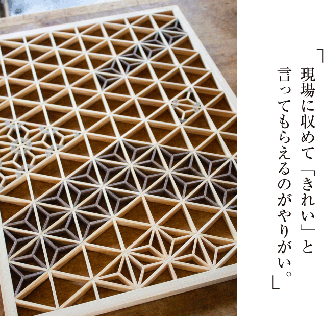 父も建具職人だったので幼い頃から仕事を見ており、自然と職人を目指していました。組手障子が完成するまでには、決まった書式に設計図を描き、部品作って組み上げ…と数週間はかかります。入社してすぐに会社で建具の全国大会に出品するということで、社員総出で制作をしました。その部品作りが最初の大きな仕事でしたね。組手細工は腕がないとできない、手間も時間もかかる仕事。その分、思い入れのある方が注文してくださっていると思います。