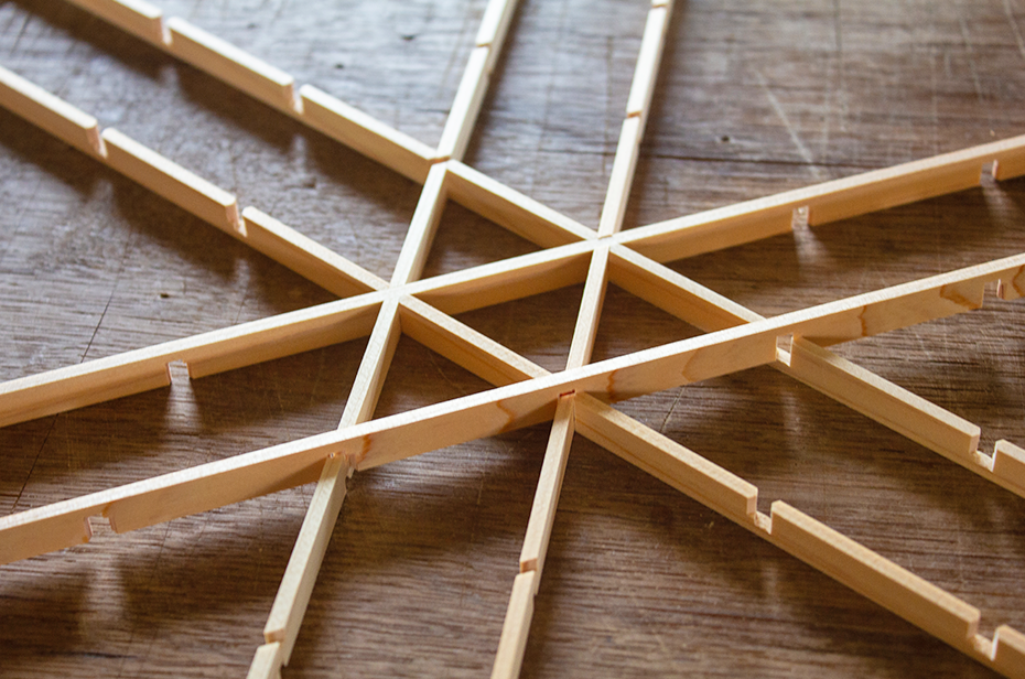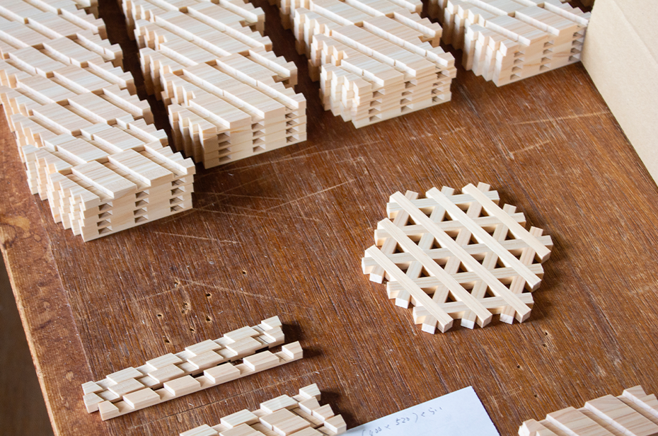 一番楽しいのは木片を組み入れている時間。思い通りにぴったりはまると嬉しいですし、一日があっという間に終わります。組手障子を作るには、組む技術だけでなく木を見る力も必要です。部材を効率よく、思い通りに仕上げるには裏表や木目の流れも考えないといけません。今挑戦しているのは立体の作品。サッカーボールのように六角形の小さな組手細工を組み合わせて球体を作ろうとしています。
