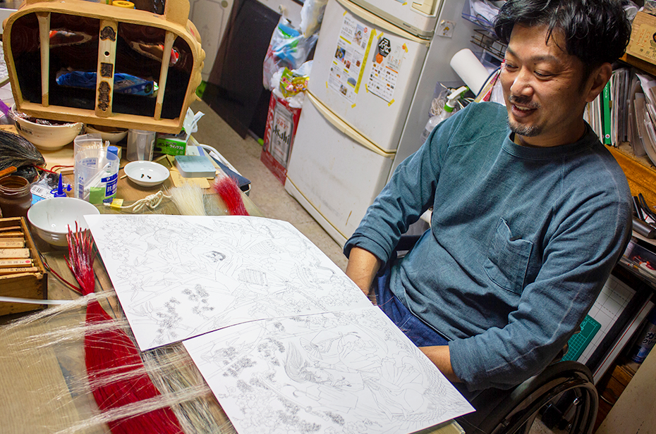 目の色、耳や前髪の毛色、歯の形、眉毛や鼻の形…。どの獅子組も他とは違った獅子頭を作りたいという思いが強いので、そんな期待や要望に応えたいと思っています。「できん」と言ったら負けですね。他所とは違うものを作っていきたいです。獅子頭に限らず、祭りに必要なものは何でも作ります。油単やはっぴの図案を一から一緒に考えることもありますし、天狗面や花笠なども作ります。