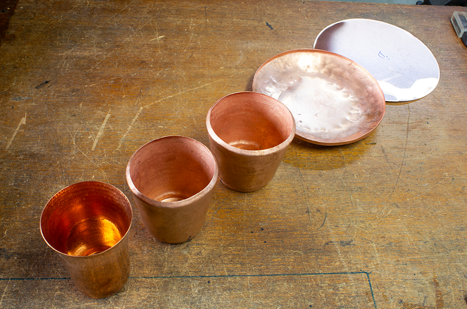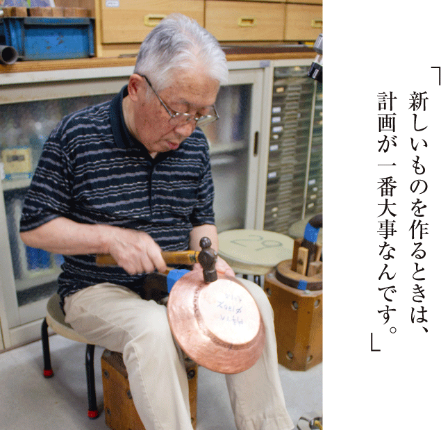 きれいに仕上がったときは、やはり嬉しいです。その一方で、やり直しがきかない難しさもあります。実際に作ってみても銅板が足りなければ、そこで終わり。それが一枚の銅板から形を生み出す打出し銅器ならではの厳しさです。最近は、銅製品を使う人も少なくなりましたが、きちんと手入れをすれば、長く使い続けられます。だからこそ、こだわりをもって大切に使ってもらえたら嬉しいですね。