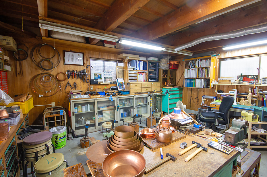 道具や設計図が整然と並ぶ吉原さんの工房。そこには、師匠・大山さんから受け継いだ道具も多く並ぶ。その道具や技とともに、大山さんが続けてきた教室も引き継いだ。今も希望者が打出し銅器に触れられる場所を守り続け、吉原さん自身がそうであったように、次の世代へと繋がるきっかけをつくっている。